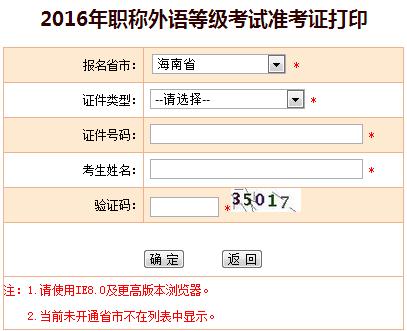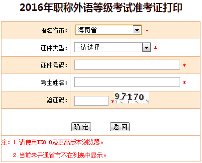 海南省2016年职称英语考试准考证打印将于2016年3月14日开始,截止时间为3月23日,准考证一律采用网上打印。目前中国人事考试网职称英语准考证打印入口已显示海南省,请海南考区考生注意...