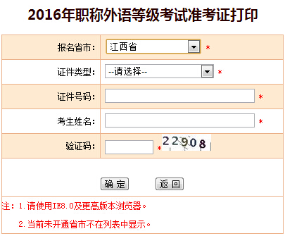 各省市2016年职称英语考试准考证打印陆续开始了,江西省职称英语考试准考证打印时间为3月14日9:00,结束时间为3月23日17:00,目前中国人事考试网职称英语考试准考证打印入口已显示江西省...