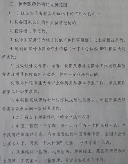 2016年山东职称英语免试条件 区别对待,部分专业技术人员可不参加职称外语考试或放宽外语成绩要求 (一)经证明具有较高外语能力的下列人员可不参加职称外语考试: 1.取得经国家教育...