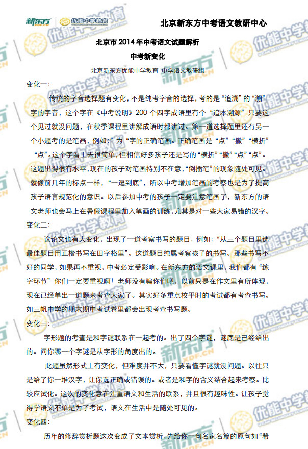 新东方在线中考网讯 北京2014中考已经落下帷幕,新东方在线中考网编辑第一时间汇总整理《2014北京中考语文新变化解析(新东方版)》,邀请北京新东方优能中学名师第一时间详情解析了北...