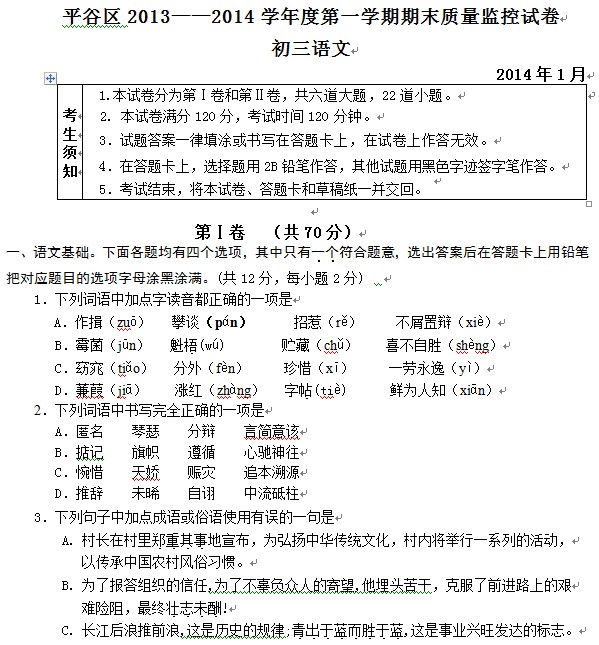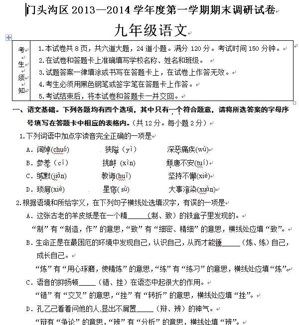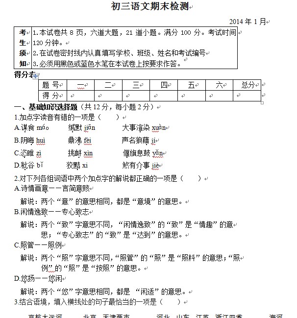 新东方在线中考考试频道为您提供最新的北京通州区2013-2014学年初三第一学期期末语文试题答案,以及其它2014中考的试题、答案、资料下载等相关内容,新东方在线为您的中考考试保驾护航...