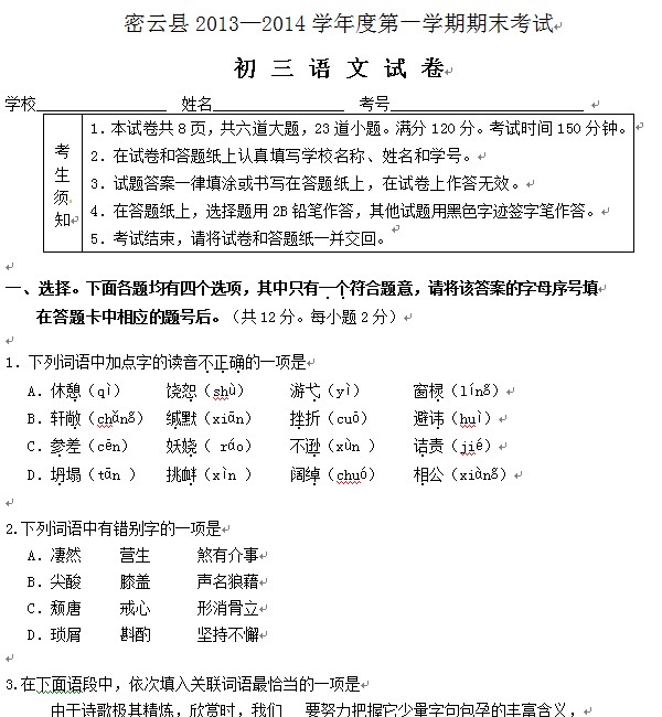 来源 : 中学学科网 01月27日 18:39 关键字 : 2014初三语文期末考试 2014初三语文试题 密云