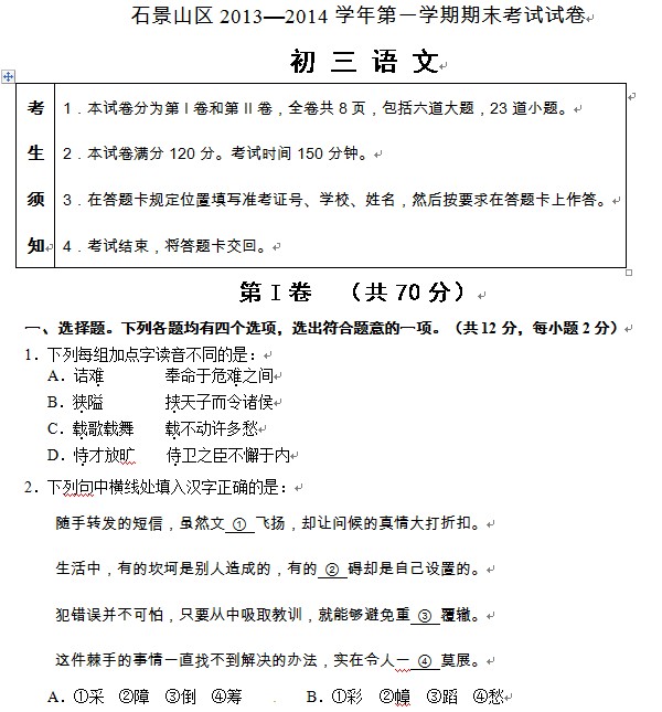 新东方在线中考考试频道为您提供最新的北京石景山区2013-2014学年初三第一学期期末语文试题答案,以及其它2014中考的试题、答案、资料下载等相关内容,新东方在线为您的中考考试保驾护...