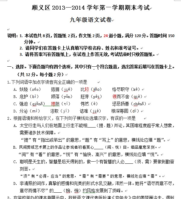 新东方在线中考考试频道为您提供最新的北京顺义区2013-2014学年初三第一学期期末语文试题答案,以及其它2014中考的试题、答案、资料下载等相关内容,新东方在线为您的中考考试保驾护航...