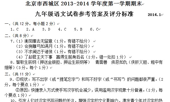 新东方在线中考考试频道为您提供最新的北京西城区2013-2014学年初三第一学期期末语文试题答案,以及其它2014中考的试题、答案、资料下载等相关内容,新东方在线为您的中考考试保驾护航...