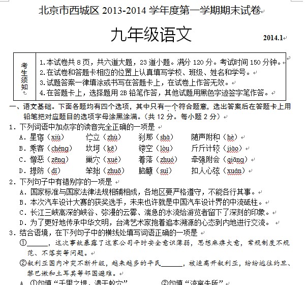 来源 : 中学学科网 01月27日 18:50 关键字 : 2014初三语文期末考试 2014初三语文试题 西城