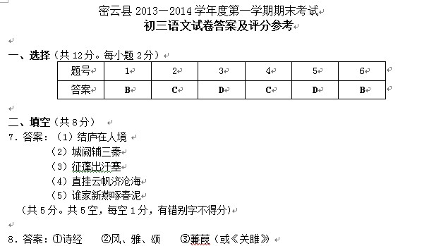 来源 : 中学学科网 01月27日 18:36 关键字 : 2014初三语文期末考试 2014初三语文试题 密云