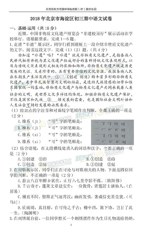 2018-2019学年北京海淀初三期中语文考试已经结束,新东方在线中考网整理了《2018北京海淀初三期中语文试题逐题解析》,供同学们参考。 点击下载:海淀区初三期中考试试题及答案[page]...