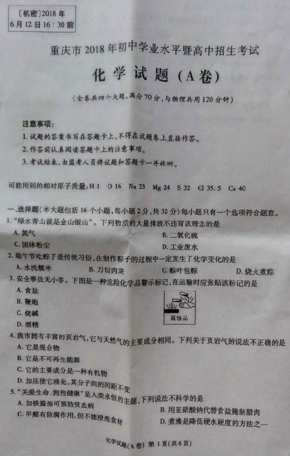 2018重庆中考化学试题及答案汇总:2018年重庆中考已结束,新东方在线中考网小编将2018重庆中考化学试题及答案整理如下,供考生参考。 中考过后,同学们将会进行中考志愿填报、中考...