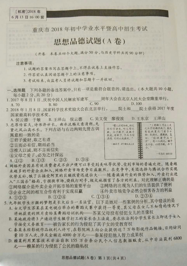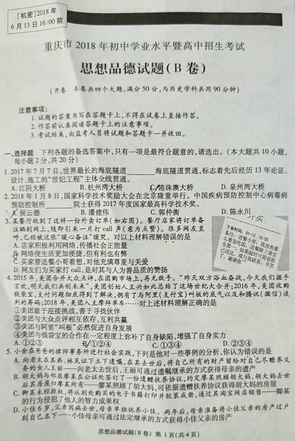 2018重庆中考思想品德试题及答案汇总(B卷):2018年重庆中考已结束,新东方在线中考网小编将2018重庆中考思想品德试题及答案(B卷)整理如下,供考生参考。 2018年重庆中考思想品德试...