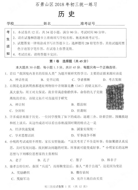 2018北京石景山区中考一模考试已经结束,新东方在线中考网整理了《北京石景山区2018中考历史一模试题及答案》,供同学们和家长参考。 点击下载:北京2018中考一模试题及答案[page][pa...