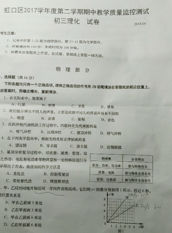 来源 : 网络 05月03日 17:24 关键字 : 2018年中考物理二模试题 虹口区二模试题