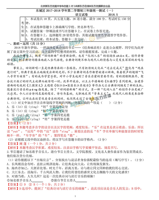 2018北京东城区中考一模考试已经结束,新东方在线中考网整理了《北京东城区2018中考语文一模试题及答案》,供同学们和家长参考。 点击下载:北京2018中考一模试题及答案[page][page][...