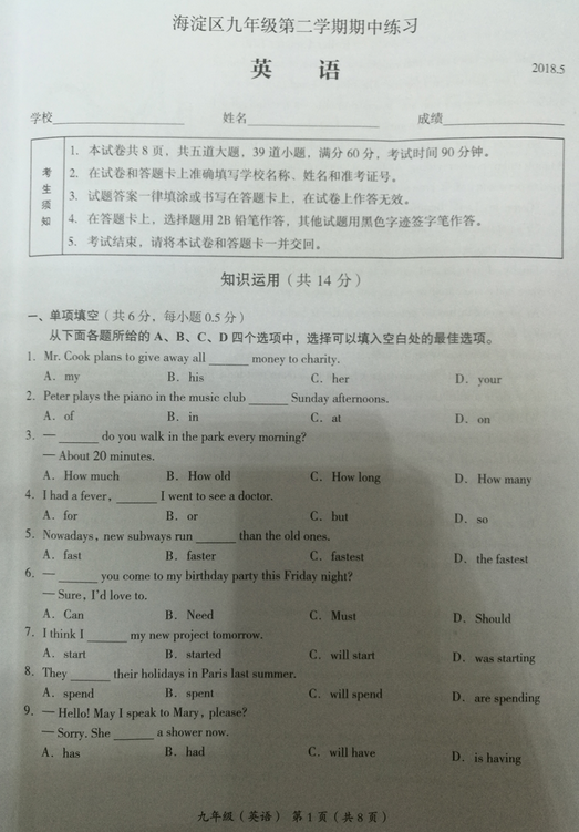 2018北京海淀区中考一模考试已经结束,新东方在线中考网整理了《北京海淀区2018中考英语一模试题及答案》,供同学们和家长参考。 点击下载:北京2018中考一模试题及答案[page][page][...