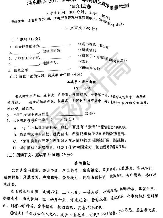 来源 : 网络 01月29日 17:35 关键字 : 2018浦东新区初三一模 初三一模语文试题答案