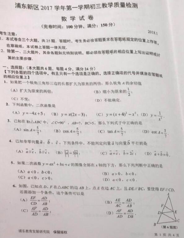 来源 : 网络 01月29日 17:36 关键字 : 2018浦东新区初三一模 初三一模数学试题答案