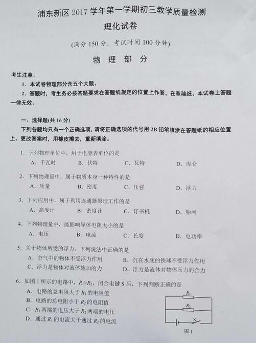 来源 : 网络 01月29日 17:40 关键字 : 2018浦东新区初三一模 初三一模物理试题答案
