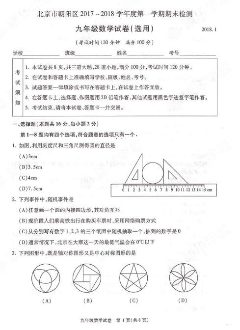 来源 : 网络 01月17日 10:40 关键字 : 2018朝阳初三期末数学试题 初三期末数学答案