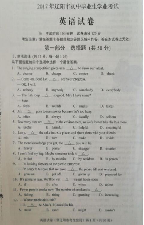 2017各地中考陆续举行,新东方在线中考网将第一时间整理中考试题及答案,供中考生们参考。下面是《辽宁辽阳2017中考英语试题及答案》,更多2017年辽宁辽阳中考试题及答案可查看2017中考试...