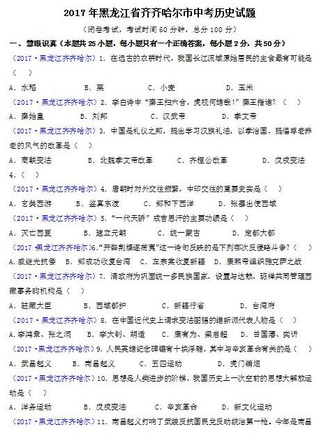 2017各地中考陆续举行,新东方在线中考网将第一时间整理中考试题及答案,供中考生们参考。下面是《黑龙江大兴安岭2017中考历史试题及答案》,更多2017年黑龙江大兴安岭中考试题及答案可查...