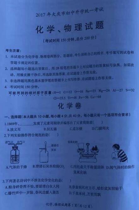 来源 : 网络 08月16日 10:24 关键字 : 大庆中考试题 大庆中考化学试题答案