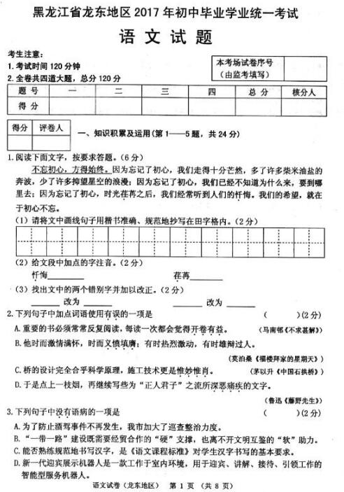 2017各地中考陆续举行,新东方在线中考网将第一时间整理中考试题及答案,供中考生们参考。下面是《黑龙江七台河2017中考语文试题及答案》,更多2017年黑龙江七台河中考试题及答案可查看20...