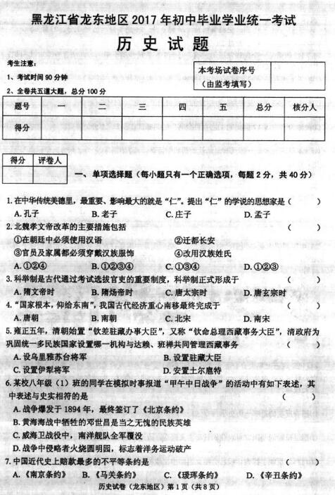 2017各地中考陆续举行,新东方在线中考网将第一时间整理中考试题及答案,供中考生们参考。下面是《黑龙江双鸭山2017中考历史试题及答案》,更多2017年黑龙江双鸭山中考试题及答案可查看20...