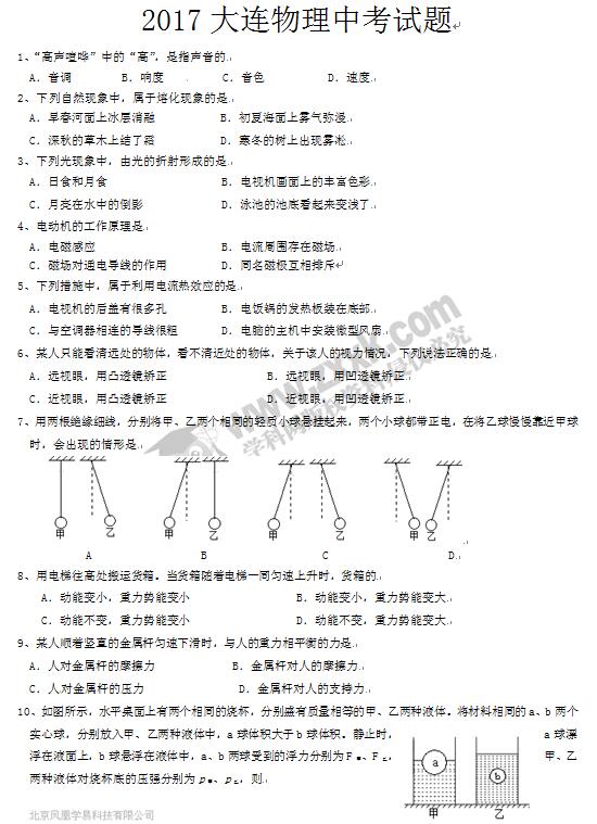 2017各地中考陆续举行,新东方在线中考网将第一时间整理中考试题及答案,供中考生们参考。下面是《辽宁大连2017中考物理试题及答案》,更多2017年辽宁大连中考试题及答案可查看2017中考试...