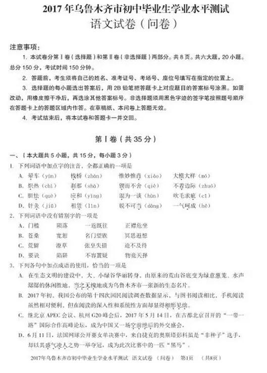 2017各地中考陆续举行,新东方在线中考网将第一时间整理中考试题及答案,供中考生们参考。下面是《新疆乌鲁木齐2017中考语文试题及答案》,更多2017年新疆乌鲁木齐中考试题及答案可查看20...