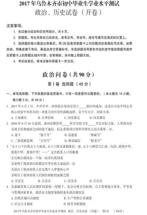 2017各地中考陆续举行,新东方在线中考网将第一时间整理中考试题及答案,供中考生们参考。下面是《新疆乌鲁木齐2017中考政治试题及答案》,更多2017年新疆乌鲁木齐中考试题及答案可查看20...