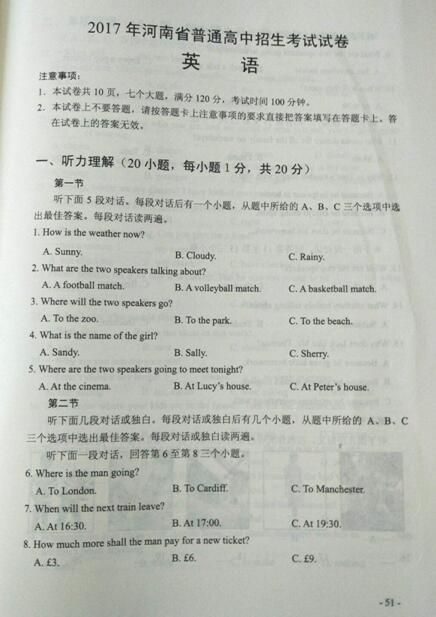 2017各地中考陆续举行,新东方在线中考网将第一时间整理中考试题及答案,供中考生们参考。下面是《河南2017中考英语试题及答案》,更多2017年河南中考试题及答案可查看2017中考试题及答案...