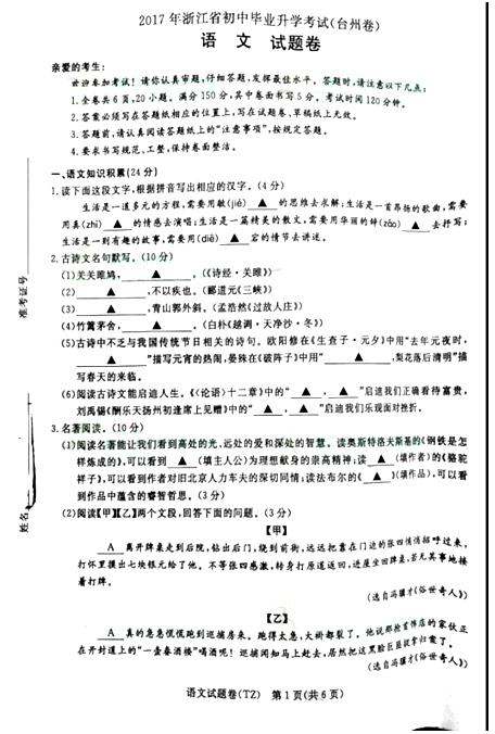 2017各地中考陆续举行,新东方在线中考网将第一时间整理中考试题及答案,供中考生们参考。下面是《浙江台州2017中考语文试题及答案》,更多2017年浙江台州中考试题及答案可查看2017中考试...