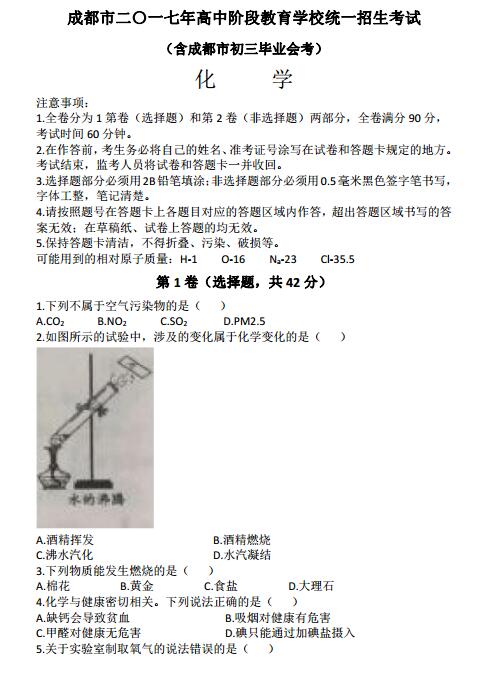 2017各地中考陆续举行,新东方在线中考网将第一时间整理中考试题及答案,供中考生们参考。下面是《四川成都2017中考化学试题及答案》,更多2017年四川成都中考试题及答案可查看2017中考试...