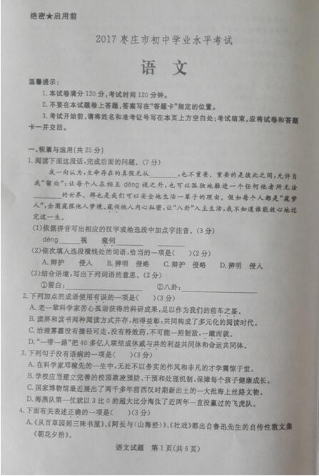 2017各地中考陆续举行,新东方在线中考网将第一时间整理中考试题,供中考生们参考。下面是《山东枣庄2017中考语文试题及答案》,更多2017年山东枣庄中考试题可查看2017中考试题及答案专题...