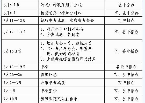 2016年济宁市高中段学校招生工作日程表 4月20—30日各初中学校组织考生报名,各县市区教育局汇总报名信息。 6月10—12日初中学业考试暨高中段学校招生考试。 6月23日前成绩公布...