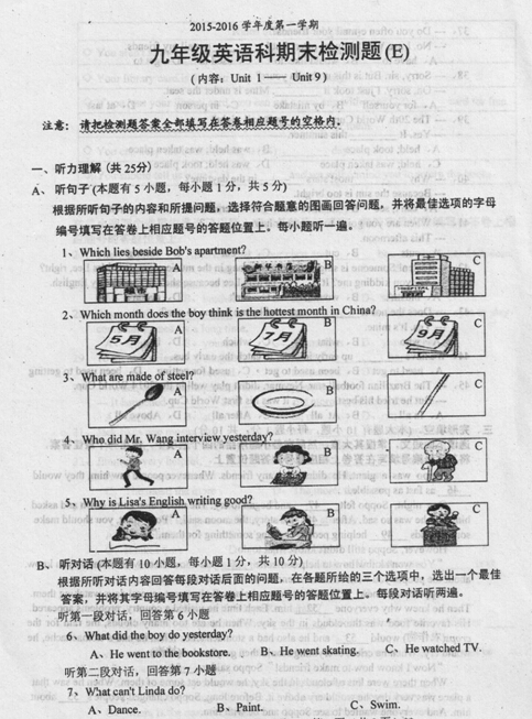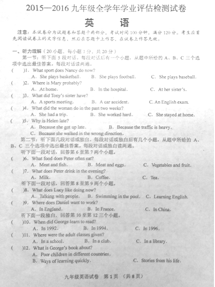 来源 : 网络 01月13日 14:54 关键字 : 初三英语试卷 英语期末试卷 英语期末答案