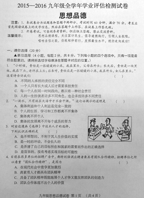 来源 : 网络 01月13日 15:23 关键字 : 初三政治试卷 政治期末试卷 政治期末答案