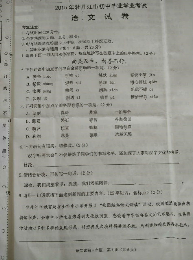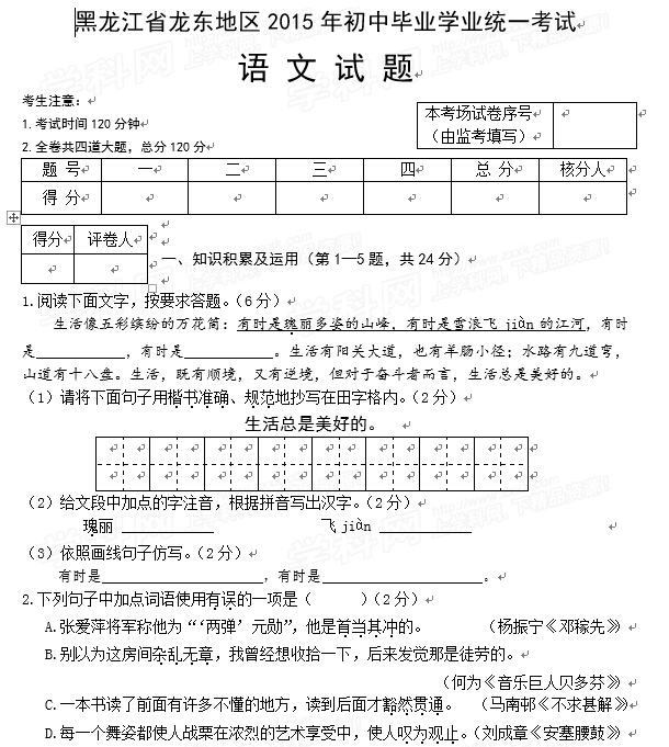 来源 : 网络 07月29日 18:10 关键字 : 黑龙江牡丹江中考语文试卷中考语文