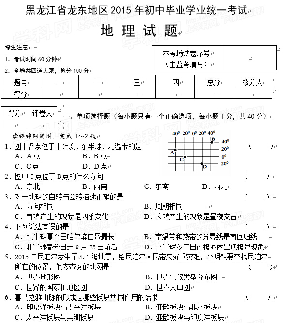 来源 : 网络 07月29日 18:17 关键字 : 黑龙江齐齐哈尔中考地理试卷中考地理