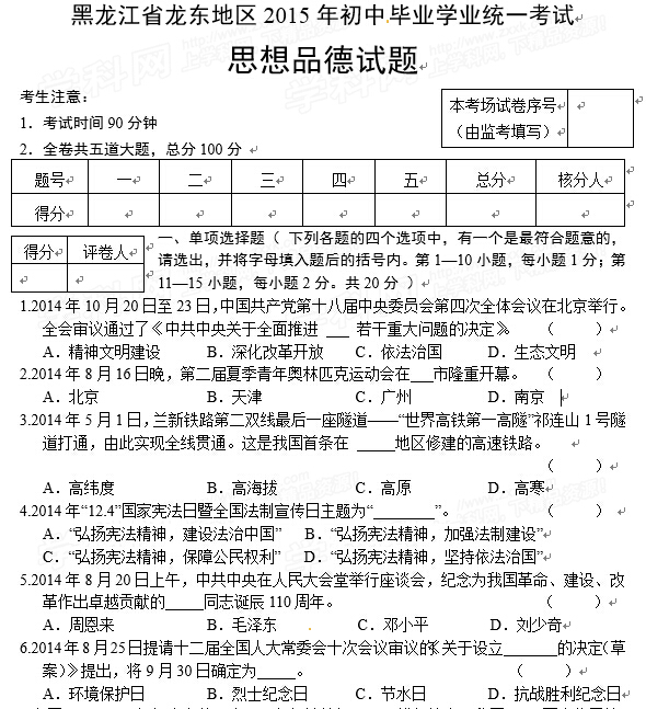 2015年黑龙江大兴安岭中考历史考试已经结束,新东方在线中考网第一时间整理了2015黑龙江大兴安岭中考历史试卷及答案,供同学们参考。更多2015中考最新资讯、2015中考录取分数、2015中考...