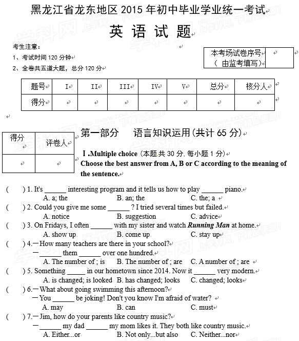 2015年黑龙江龙东中考英语考试已经结束,新东方在线中考网第一时间整理了2015黑龙江龙东中考英语试卷及答案,供同学们参考。更多2015中考最新资讯、2015中考录取分数、2015中考体育等相...