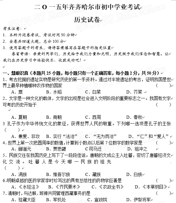 来源 : 网络 07月30日 11:05 关键字 : 黑龙江齐齐哈尔中考历史试卷中考历史
