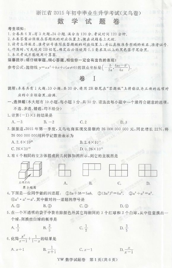 来源 : 网络 07月23日 11:05 关键字 : 浙江义乌中考数学试卷中考数学