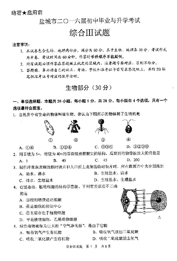 来源 : 网络 07月20日 14:38 关键字 : 江苏盐城中考生物试卷中考生物