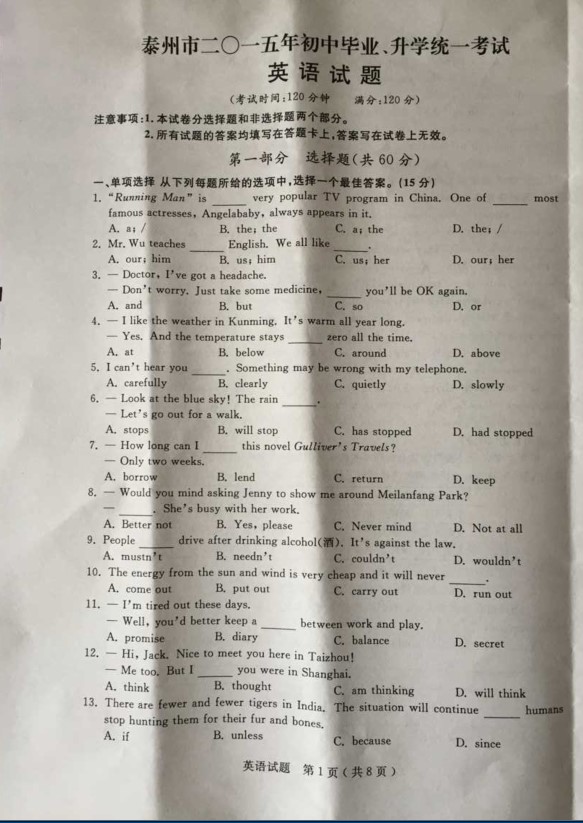 来源 : 网络 07月17日 12:21 关键字 : 江苏泰州中考英语试卷中考英语