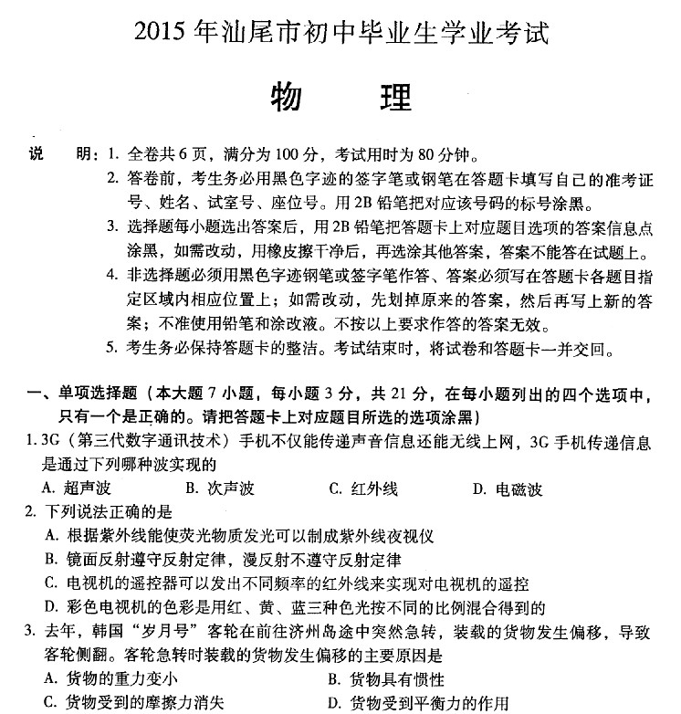 来源 : 网络 07月15日 15:00 关键字 : 广东汕尾中考物理试卷中考物理