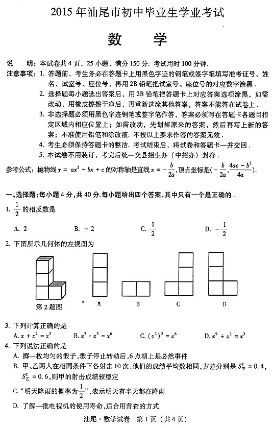 来源 : 网络 07月15日 15:29 关键字 : 广东汕尾中考数学试卷中考数学
