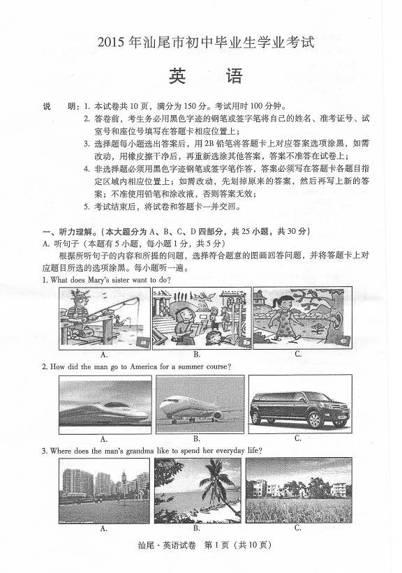 来源 : 网络 07月15日 15:35 关键字 : 广东汕尾中考英语试卷中考英语