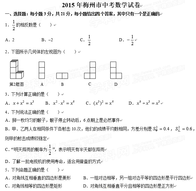 来源 : 网络 07月15日 15:48 关键字 : 广东梅州中考数学试卷中考数学