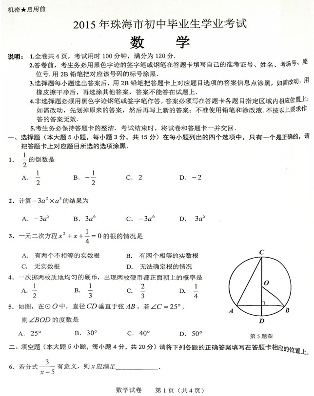 来源 : 网络 07月15日 16:05 关键字 : 广东珠海中考数学试卷中考数学